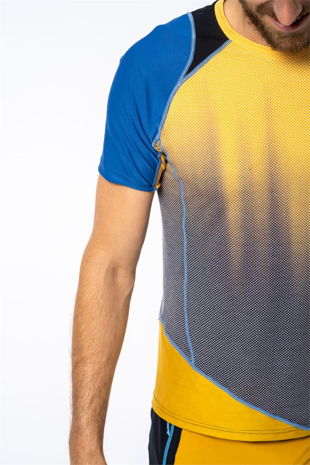 The most technical t-shirt in the collection, this year it features a completely revamped look, thanks to the new asymmetrical and innovative lines. It is designed for intense activity even in high mountains thanks to details such as differentiated texture fabrics or the laser-cut mesh band in the center of the back to promote breathability when wearing a backpack.