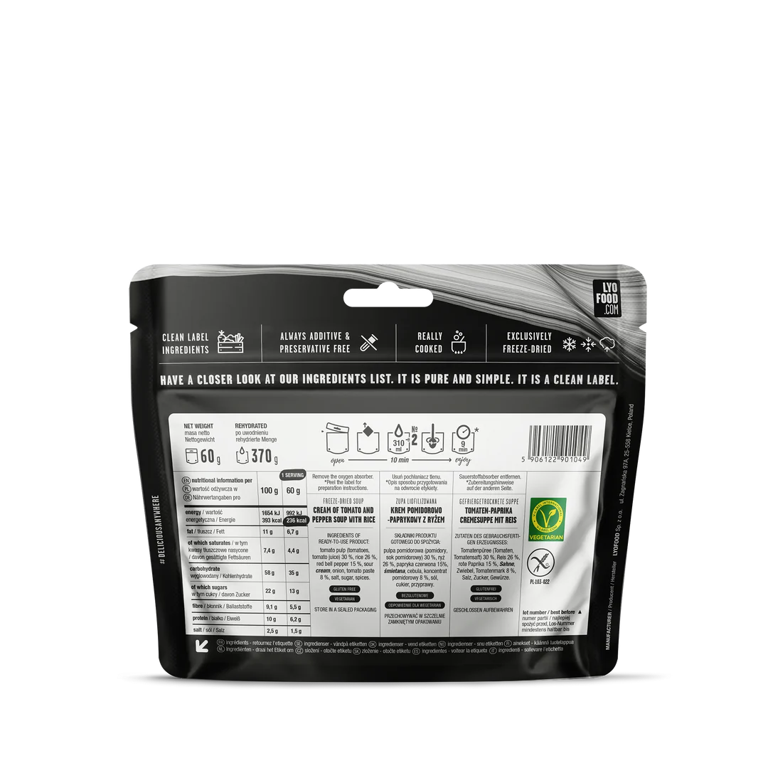 Long shelf life: LYO EXPEDITION meals can be stored for a long time. Since the water content is being removed during the freeze-drying process, microorganisms and enzymes action are inhibited. Each pouch is hermetically sealed and contains an oxygen absorber.