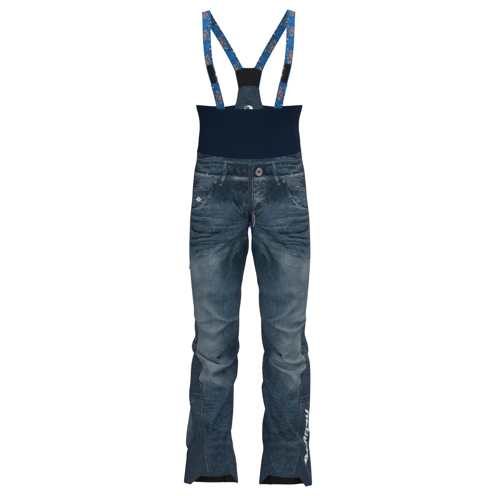 Waterproof trousers for mountaineering, ski mountaineering and ice fall climbing, a real gem in Fast & Light style, featuring a very lightweight bib with minimalist braces that make it quick and easy to wear, comfortable and stable once it is on. We have implemented an innovative fastening system that allows you to keep the braces on even if the trousers are taken off. Definitely the most stretchy, lightweight and packable in the category, designed entirely and pre-shaped for maximum ease of movement. For easy pull-on, the legs feature full-length double-slider side zips - so they can be fully opened. These trousers are constructed with Dermizax Ev, even more durable than the material used for the jackets and come with the iconic denim print. The side pockets can be opened for easy venting. The stretch, reinforced gaiters feature a width adjustment system that makes them easy to wear even over bulky boots or, if fastened.