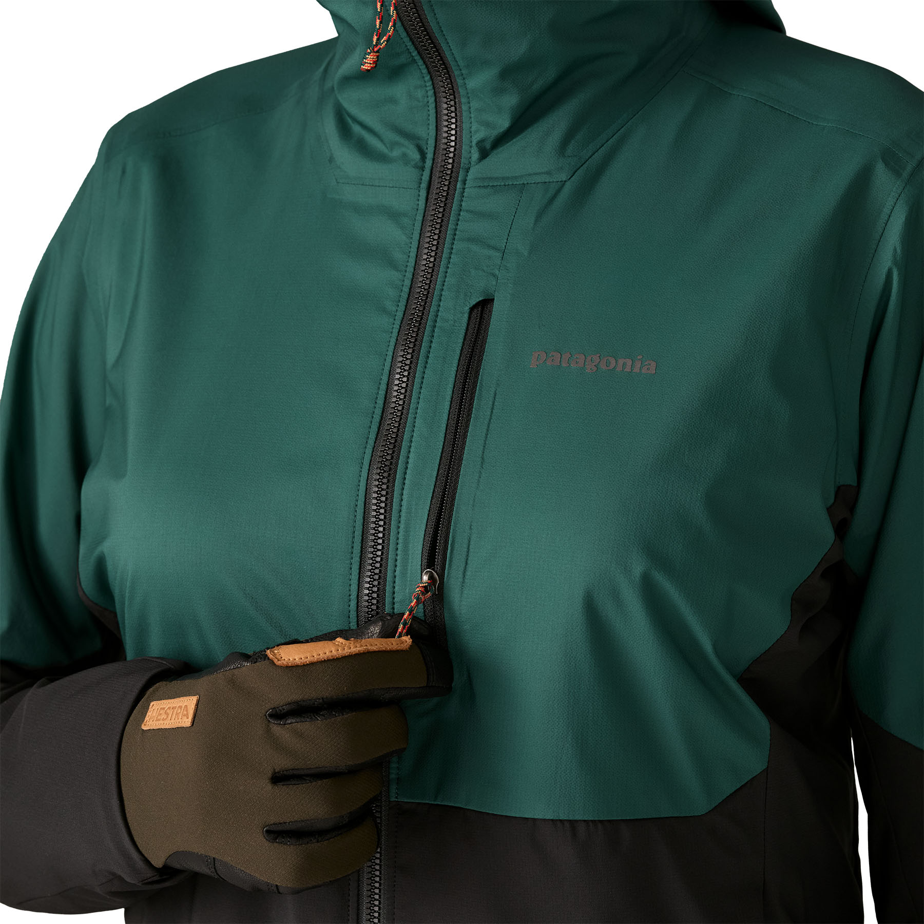 The weather-resistant fabric panels use 100% recycled ripstop shell and lining fabrics that deliver excellent breathability, stretch, and abrasion resistance, with added weather protection on the shoulders and hood.