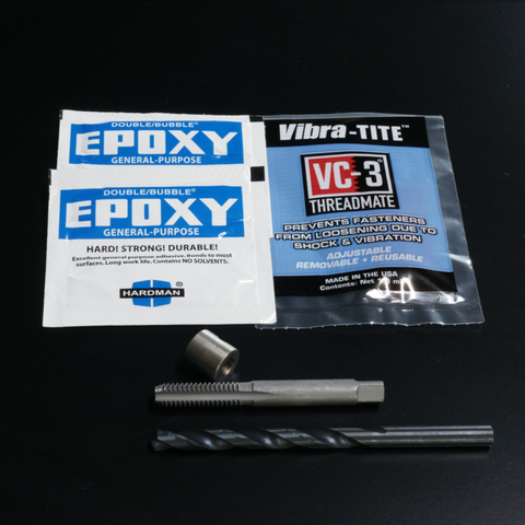 Includes: 1/4" drill bit, 1/4" drill bit stop collar, 5/16-18 bottom tap, 2x one use epoxy, Vibra-TITE VC-3 single use.