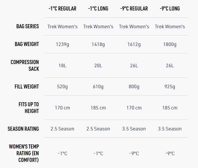 Специално проектиран за жени, Trek Women's -9 °C комбинира функционалност, простор и топлина, за да предложи максимален комфорт по време на трисезонен къмпинг, пътешествия с кемпер или автомобил. Създаден за гъвкаво използване, чувалът може да се разкопчае напълно и да се използва като юрган при топло време или да се съчетае с унисекс модел Trek, за да се образува удобна двоична система за спане.